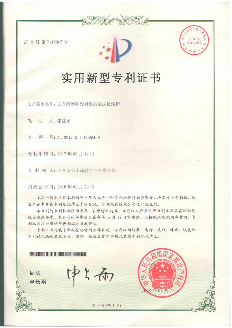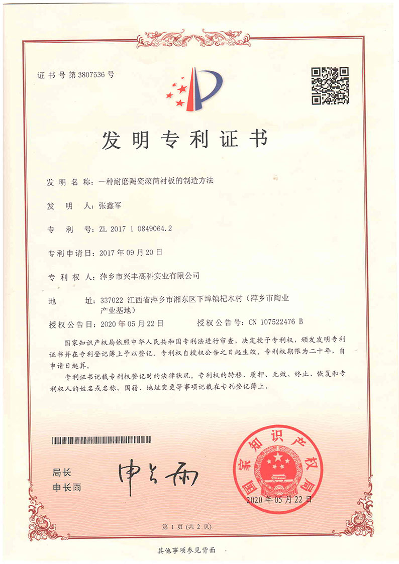 陶瓷襯板專利證書(shū)